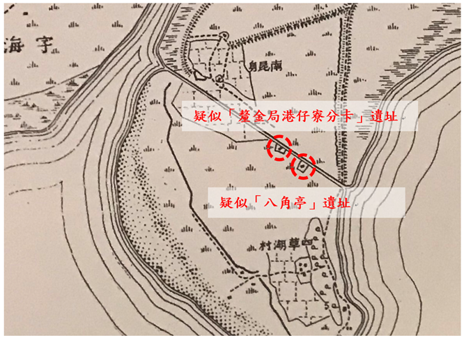 圖5、疑似「釐金局港仔寮分卡」遺址及疑似「八角亭」遺址位置